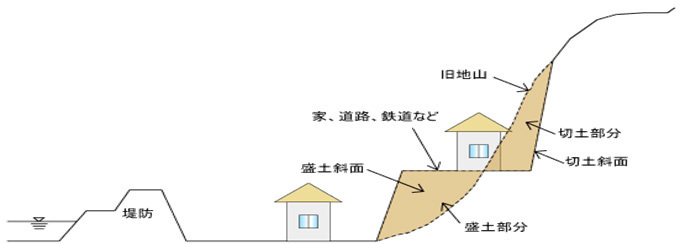 鉄道や道路、宅地造成、堤防などの建設に伴い、斜面の切り取りや盛土工事が行われ、多くの人工的な斜面が作られています。