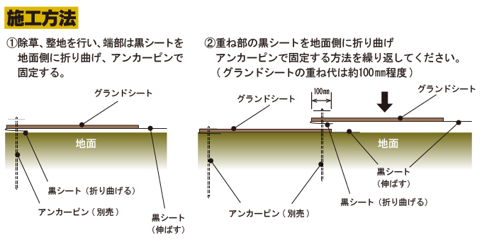 施工は除草、整地後にグランドシートを敷き、アンカーピンで固定するだけ。グランドシートはハサミで簡単にカットできるので、斜面、道路側 面、農道畦道、鉄塔下、ソーラー発電所の防草対策など様々な箇所への施工が誰でも簡単に行えます。