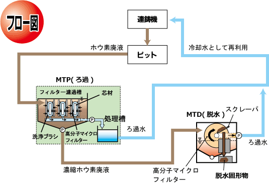 本システムは凝集剤を使用せず、高分子マイクロフィルターを活用したろ過装置と脱水装置で、物理的にホウ素廃液をろ過・脱水するシステムです。