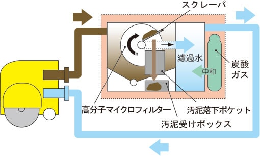 「ミズコシタロウ MTCシリーズ」は、道路カッターの切断水を化学薬品を使用せず、新開発の高分子マイクロフィルターを使用して物理的にろ過処理(汚泥処理)をします。
