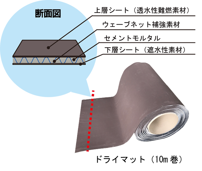 ドライマットは、ポリエステル製の立体網状構造体に(ウェーブネット)特殊セメントモルタルを含浸した複合マットです。
