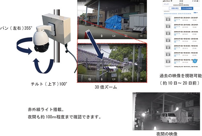 パン(左右)355°、チルト(上下)100°、ズーム30倍(光学20倍、デジタル10倍※)。MicroSD128GB搭載。約10日~20日程度映像が記録されます。(容量がいっぱいになると古いファイルから自動で上書き保存されていきます。)