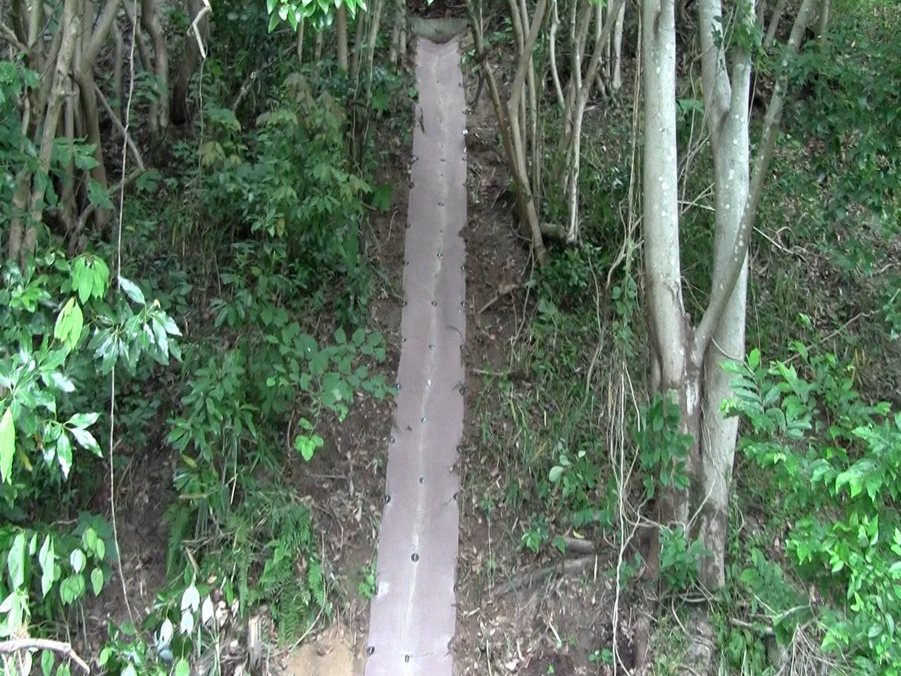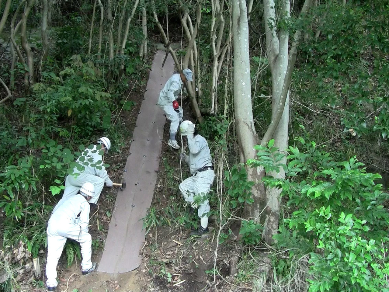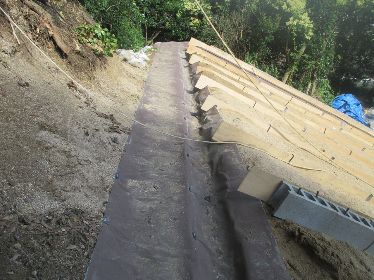 表面を素掘りし、ドライマットを敷設すれば簡易な排水溝ができます。縦排水工、横排水工、小段排水工にも利用できます。大雨、集中豪雨(ゲリラ豪雨)、線状降水帯対策として有効です。