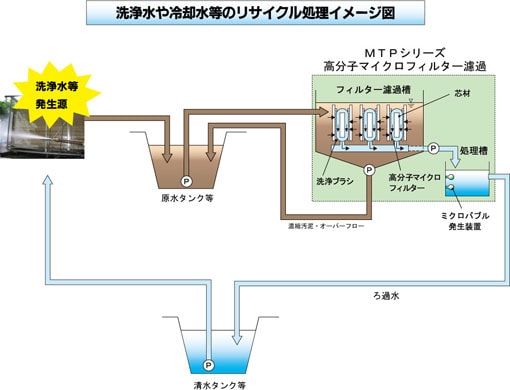 「ミズコシタロウ MTPシリーズ」は、化学薬品を使用せず、新開発の高分子マイクロフィルターを使用して物理的にろ過処理をするので、洗浄水や切断用冷却水等として再利用しても悪影響がありません。