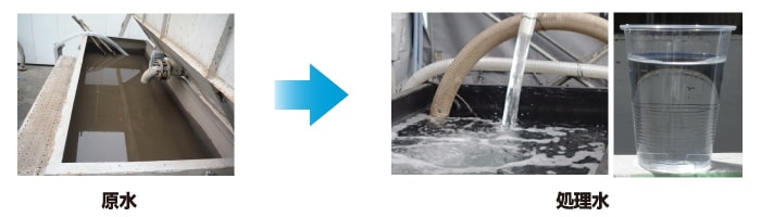 処理水は循環再利用し、濃縮水は脱水機で脱水処理を行います。